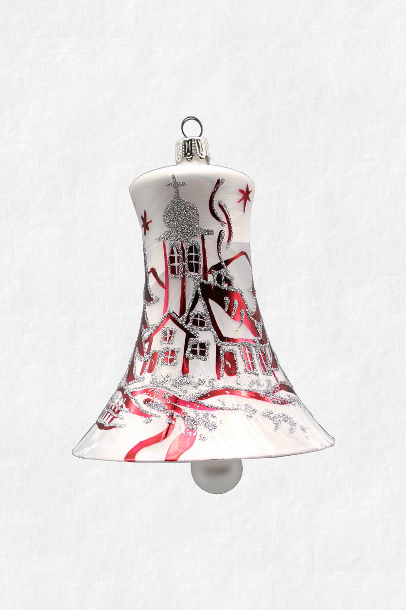 Diese Glocke mundgeblasenen Thüringer Glasschmuckes ist mit ihren 10 cm ein Glanzlicht für Ihre Weihnachtsstube. Die Glocke ist eisweiß und mit einer Landschaft in rot bemalt.