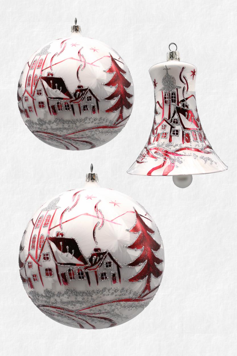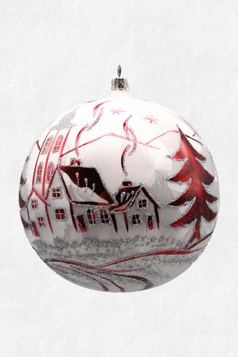 Diese Kugel mundgeblasenen Thüringer Glasschmuckes ist mit ihren 15 cm ein Glanzlicht für Ihre Weihnachtsstube. Die Kugel ist eisweiß und mit einer Landschaft in rot bemalt.