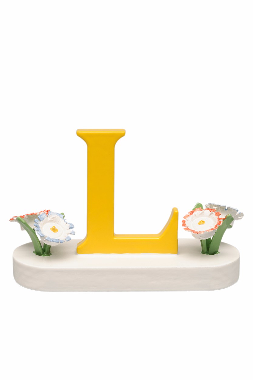 Die einzelnen Buchstaben stehen auf einem Sockelbrettchen mit kleinen Blumensträußchen links und rechts vom Buchstaben.