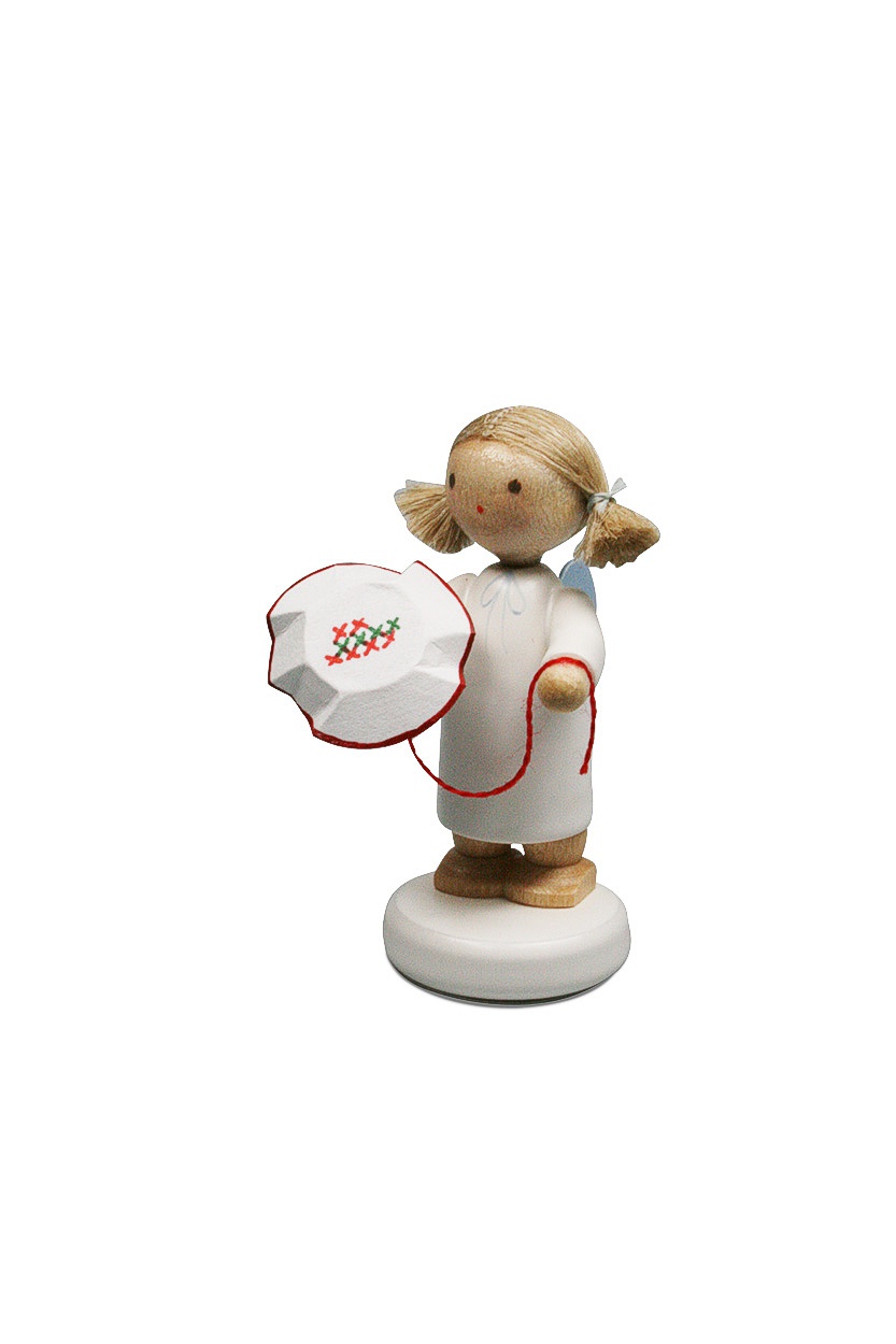 Die kleinen Miniaturen aus dem Hause Flade in Olbernhau als Kunstwerke zu bezeichnen ist sicher nicht übertrieben - hier sind noch wahre Kunsthandwerkerinnen und Spielzeugmacherinnen am Werk. Die nur 4,5 - 5 cm großen Figuren werden alle mit einer derart detailtreuen feinen Bemalung versehen, die nicht nur kleine Kinderaugen staunen lässt. Desweiteren sind das Markenzeichen der Flade-Engel die Flachshaare. Dafür wird für jede einzelne Figur eine Perücke aus Flachs angefertigt, die einzeln vernäht und auf die entsprechende Form des Haarschopfes geschnitten wird, um dann den Kopf der Figur zu zieren. Lassen auch Sie sich in den Bann der Kunstfertigkeit der Flade-Figuren ziehen. Jede der Figuren erzählt eigentlich für sich schon eine kleine Geschichte - aber mehrere Figuren zu einer Gruppe gestellt, können einem dann schon ganze Erzählungen entlocken.