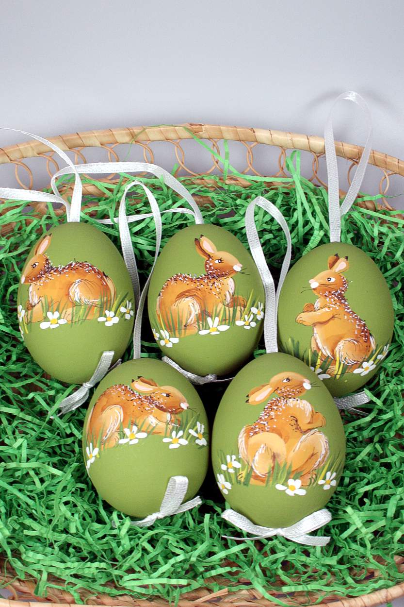 5 Hühnereier - Hasenmotive bemalt - grün