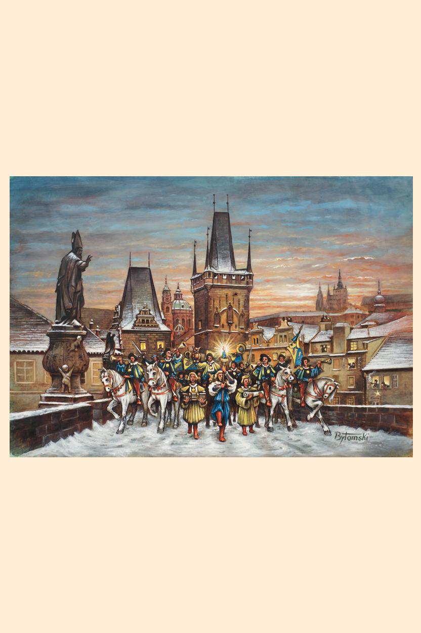 Auf diesem Prager Adventskalender sehen Sie eine Szene auf der berühmten Karlsbrücke. Der Tross, bestehend aus Rittern zu Pferde, Junkern, Knappen und Fußvolk, soll einen Zug der Prager Schlaraffen zu Ihrer Sippung darstellen.