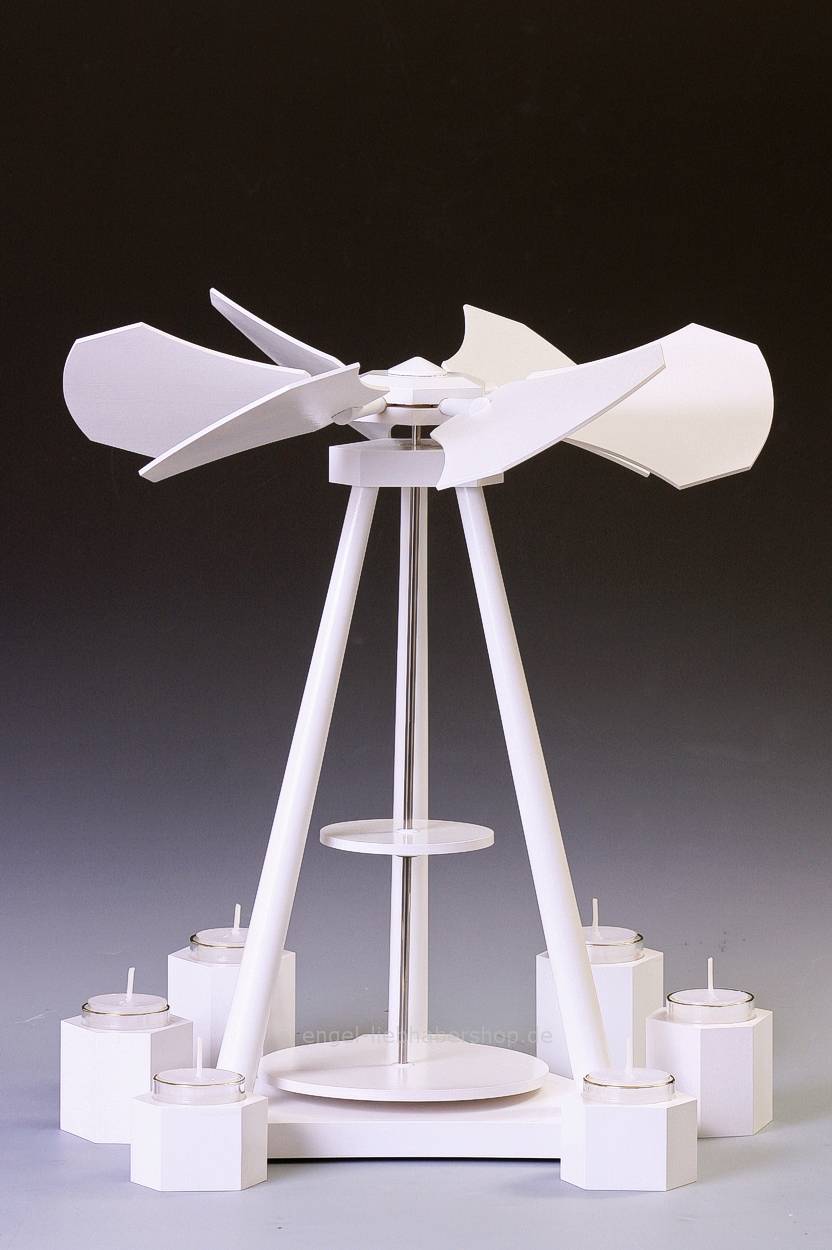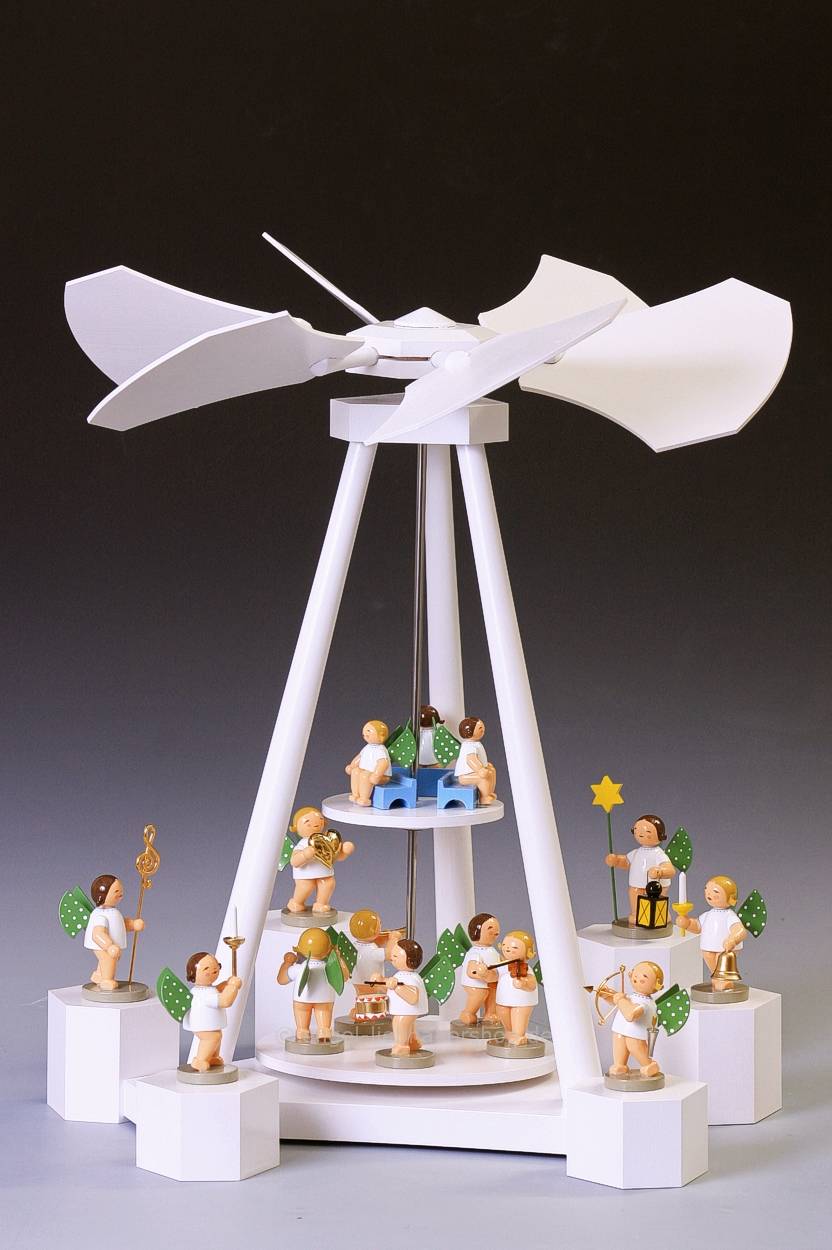 Lassen Sie sich von dieser Pyramide verzaubern. 8 Grünhainichener Engel drehen und weitere 6 Engel können auf den losen Sockeln individuell angeordnet werden. Die Sockel sind so gearbeitet, dass diese auf einer Seite plan gearbeitet sind und auf der anderen Seite ein Teelicht mit Glaseinsatz aufnehmen können, um die Pyramide in der Weihnachtszeit auch drehen lassen zu können.