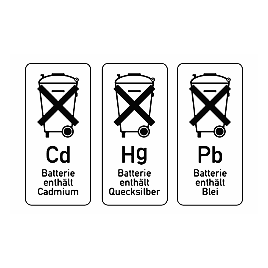 Auf diese Pflicht weist die durchgestrichene Mülltonne hin, die auf alle Verpackungen von Batterien aufgedruckt ist. Außerdem finden Sie dort auch die chemischen Symbole der Stoffe Cadmium (Cd), Blei (Pb) oder Quecksilber (Hg), sofern diese in Konzentrationen oberhalb der Grenzwerte enthalten sind.