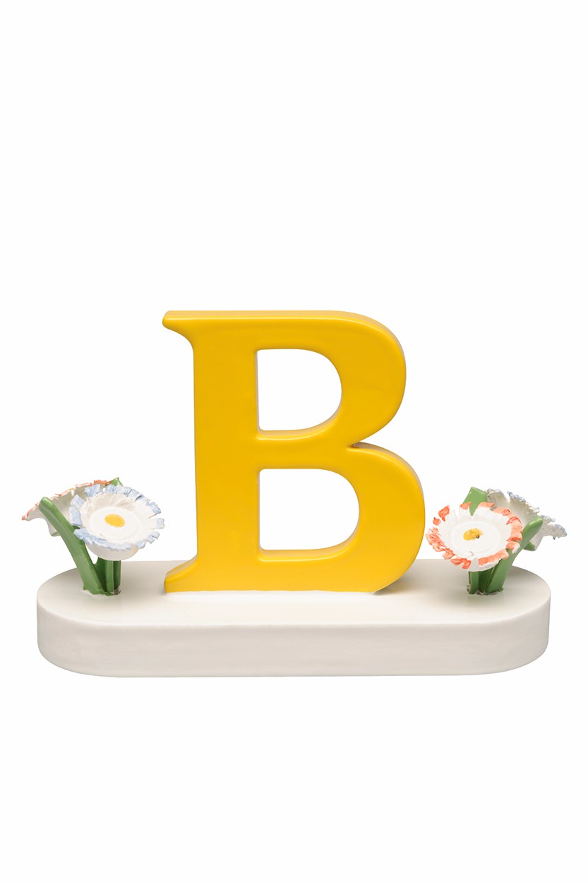 Die einzelnen Buchstaben stehen auf einem Sockelbrettchen mit kleinen Blumensträußchen links und rechts vom Buchstaben.