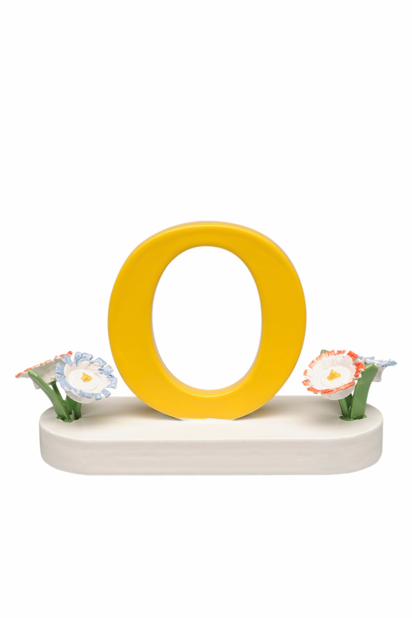 Die einzelnen Buchstaben stehen auf einem Sockelbrettchen mit kleinen Blumensträußchen links und rechts vom Buchstaben.