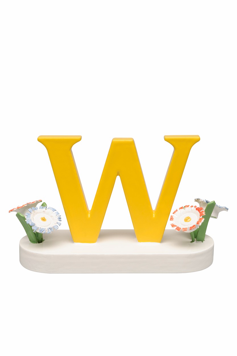 Die einzelnen Buchstaben stehen auf einem Sockelbrettchen mit kleinen Blumensträußchen links und rechts vom Buchstaben.