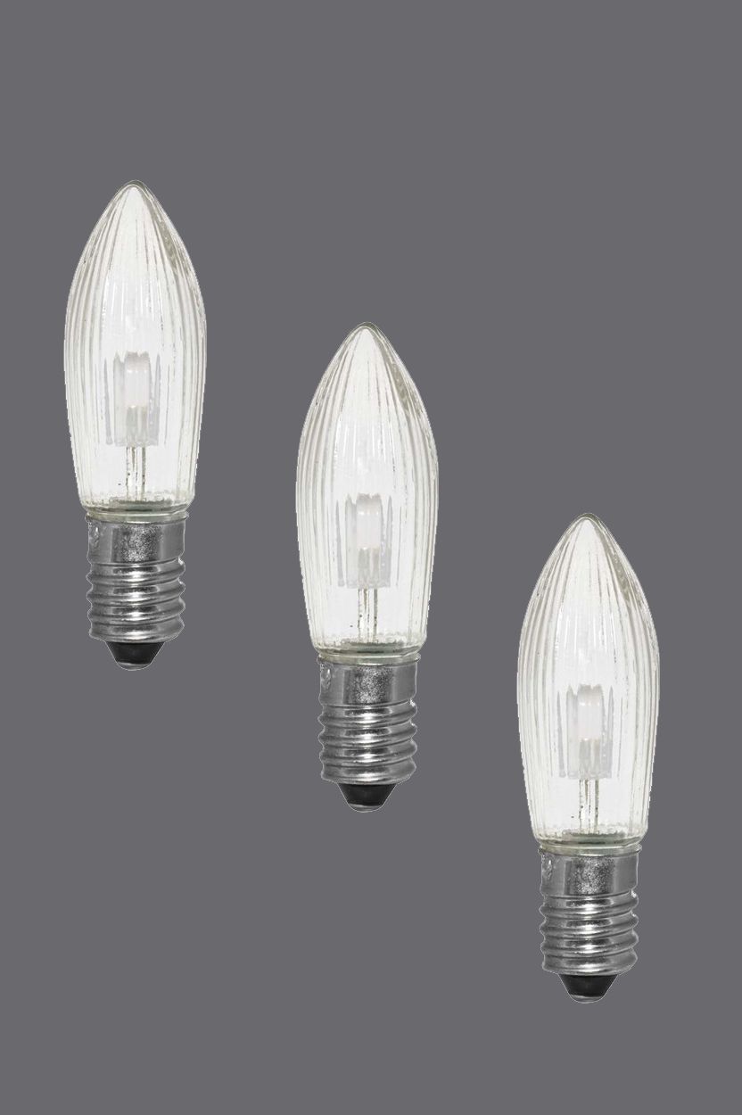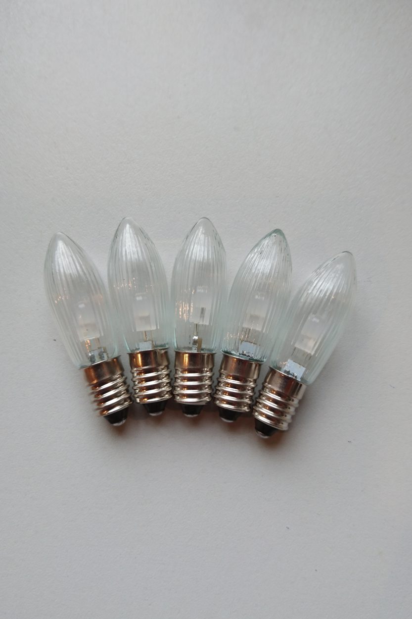 Die LED-Dioden Riffelkerzen haben eine Länge von 4,6 cm, eine Fassung E10 und sind in unterschiedlicher Volt-Ausführung (je nach Kerzenanzahl) erhältlich.