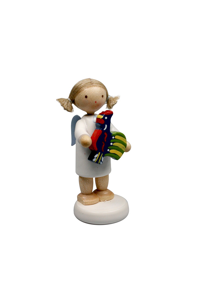 Die kleinen Miniaturen aus dem Hause Flade in Olbernhau als Kunstwerke zu bezeichnen ist sicher nicht übertrieben - hier sind noch wahre Kunsthandwerkerinnen und Spielzeugmacherinnen am Werk. Die nur 4,5 - 5 cm großen Figuren werden alle mit einer derart detailtreuen feinen Bemalung versehen, die nicht nur kleine Kinderaugen staunen lässt. Desweiteren sind das Markenzeichen der Flade-Engel die Flachshaare. Dafür wird für jede einzelne Figur eine Perücke aus Flachs angefertigt, die einzeln vernäht und auf die entsprechende Form des Haarschopfes geschnitten wird, um dann den Kopf der Figur zu zieren. Lassen auch Sie sich in den Bann der Kunstfertigkeit der Flade-Figuren ziehen. Jede der Figuren erzählt eigentlich für sich schon eine kleine Geschichte - aber mehrere Figuren zu einer Gruppe gestellt, können einem dann schon ganze Erzählungen entlocken.