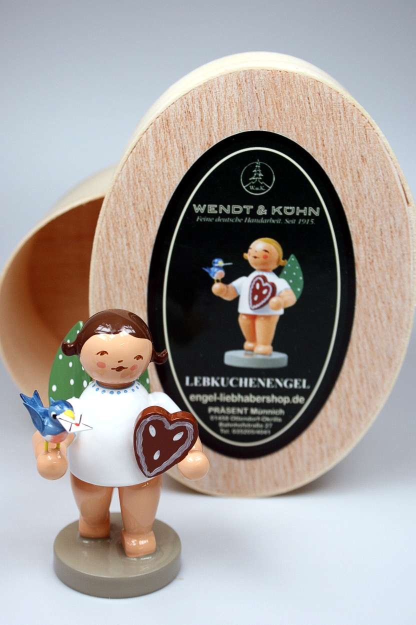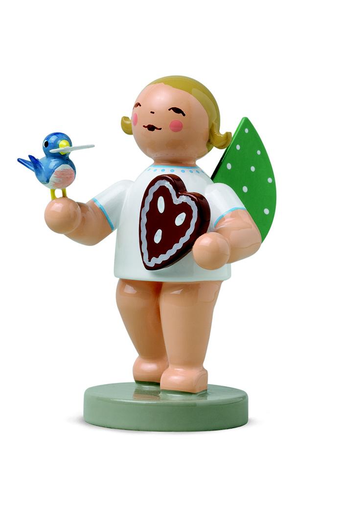 Fröhlich hält dieser Engel ein blau gefiedertes Vögelchen auf der Hand, das in seinem Schnabel einen Brief überbringt. Bestimmt würde es gern auch einmal am großen Lebkuchenherz knabbern, welches der Engel in seiner anderen Hand trägt.