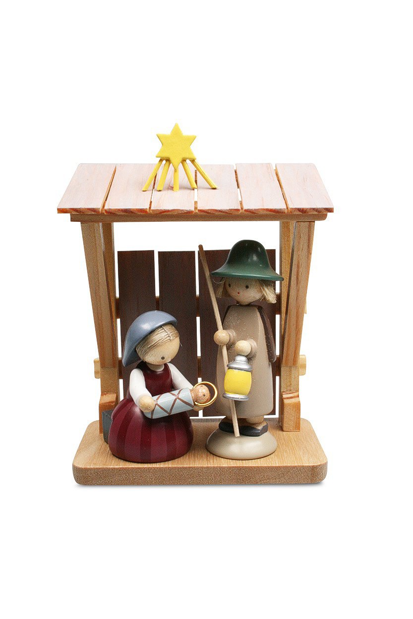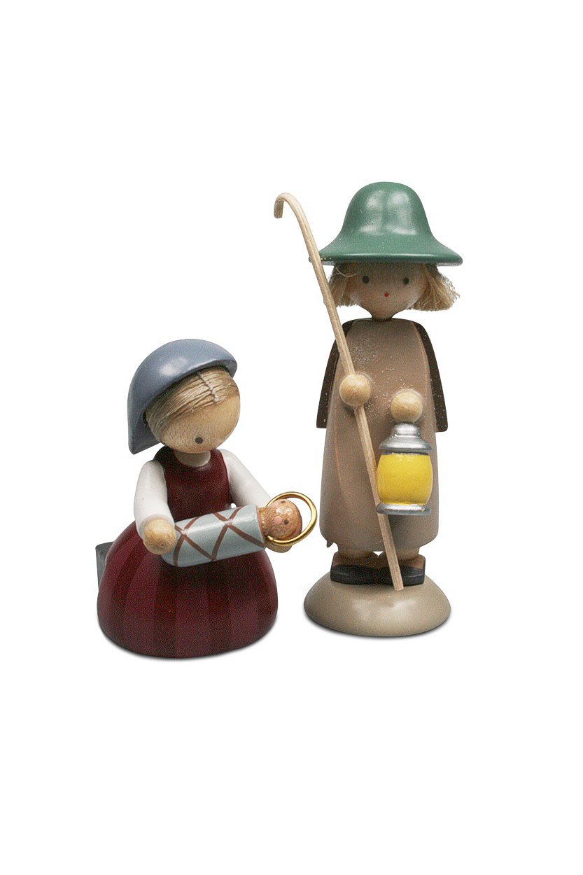 Die kleinen Miniaturen aus dem Hause Flade in Olbernhau als Kunstwerke zu bezeichnen ist sicher nicht übertrieben - hier sind noch wahre Kunsthandwerkerinnen und Spielzeugmacherinnen am Werk. Die nur 4,5 - 5 cm großen Figuren werden alle mit einer derart detailtreuen feinen Bemalung versehen, die nicht nur kleine Kinderaugen staunen lässt. Desweiteren sind das Markenzeichen der Flade-Engel die Flachshaare. Dafür wird für jede einzelne Figur eine Perücke aus Flachs angefertigt, die einzeln vernäht und auf die entsprechende Form des Haarschopfes geschnitten wird, um dann den Kopf der Figur zu zieren. Lassen auch Sie sich in den Bann der Kunstfertigkeit der Flade-Figuren ziehen. Jede der Figuren erzählt eigentlich für sich schon eine kleine Geschichte - aber mehrere Figuren zu einer Gruppe gestellt, können einem dann schon ganze Erzählungen entlocken.