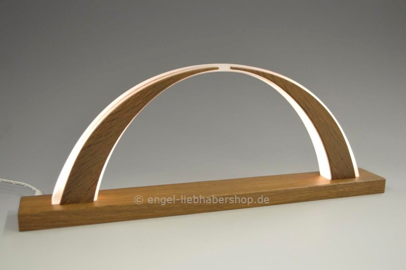 Die LED-Beleuchtung (12 Volt / 1,2 Watt - 40 Lumen) befindet sich hier nicht im Bogen, sondern einzig im Sockel. Durch die Verwendung von voll Acrylglas erreicht man einen sanften Lichtverlauf von hell am Sockel und dunkler in der Bogenmitte, außerdem vermeidet man einzelne Lichtpunkte die bei LED Bändern entstehen. Der Bogen wird dabei nicht auf dem Sockel befestigt sondern nur aufgestellt.