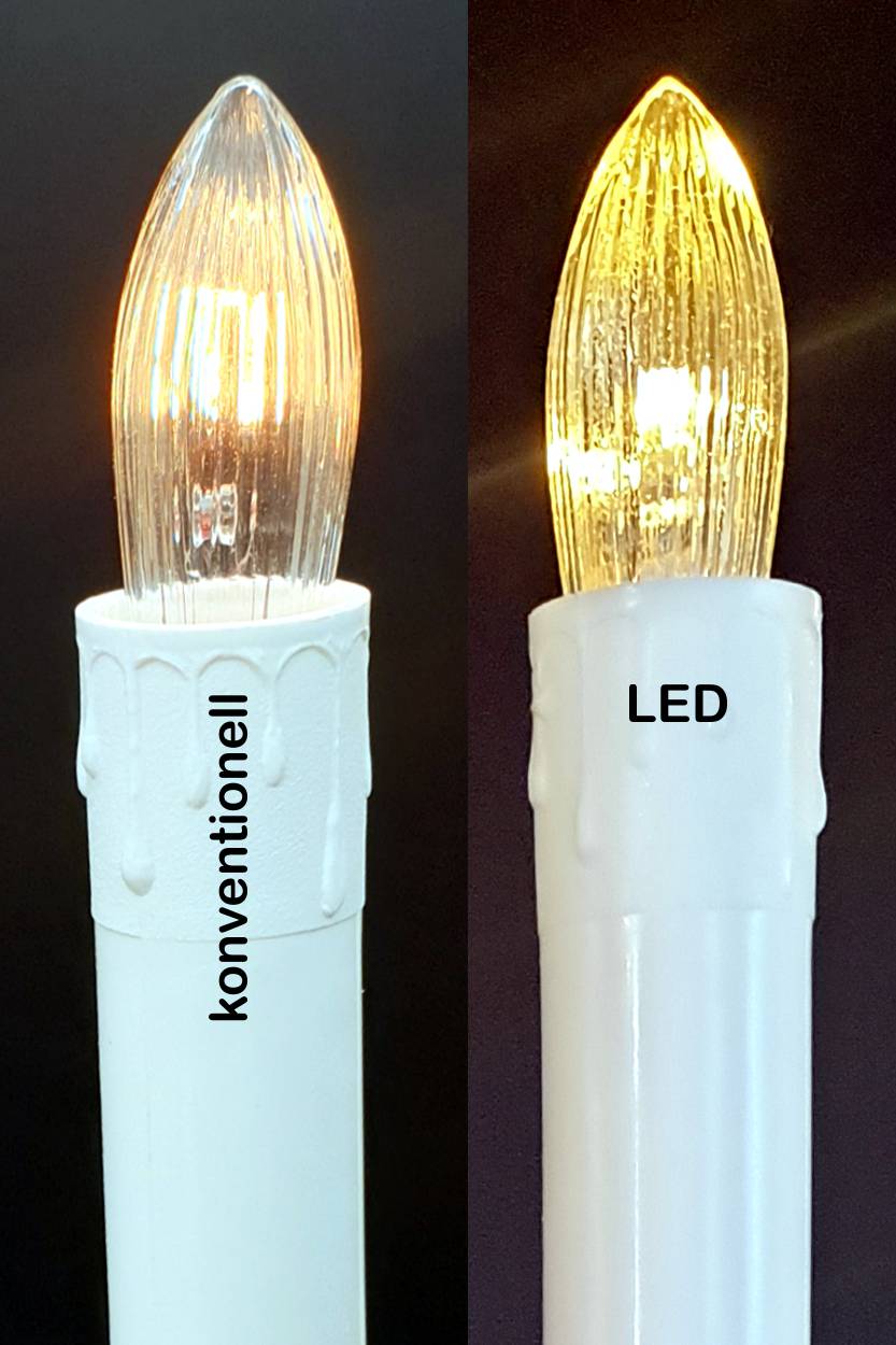 Eine gemischte Beleuchtung mit LED und Glühbirnchen ist nicht möglich. Sie müssen sich entscheiden, entweder alles mit LED-Riffelkerzen oder alles mit Glühbirnchen-Riffelkerzen bestücken!