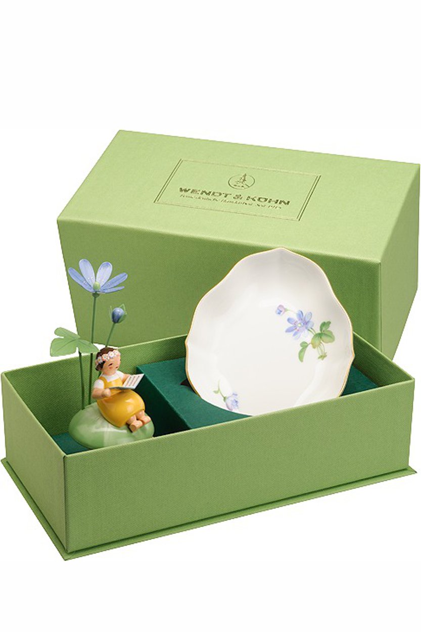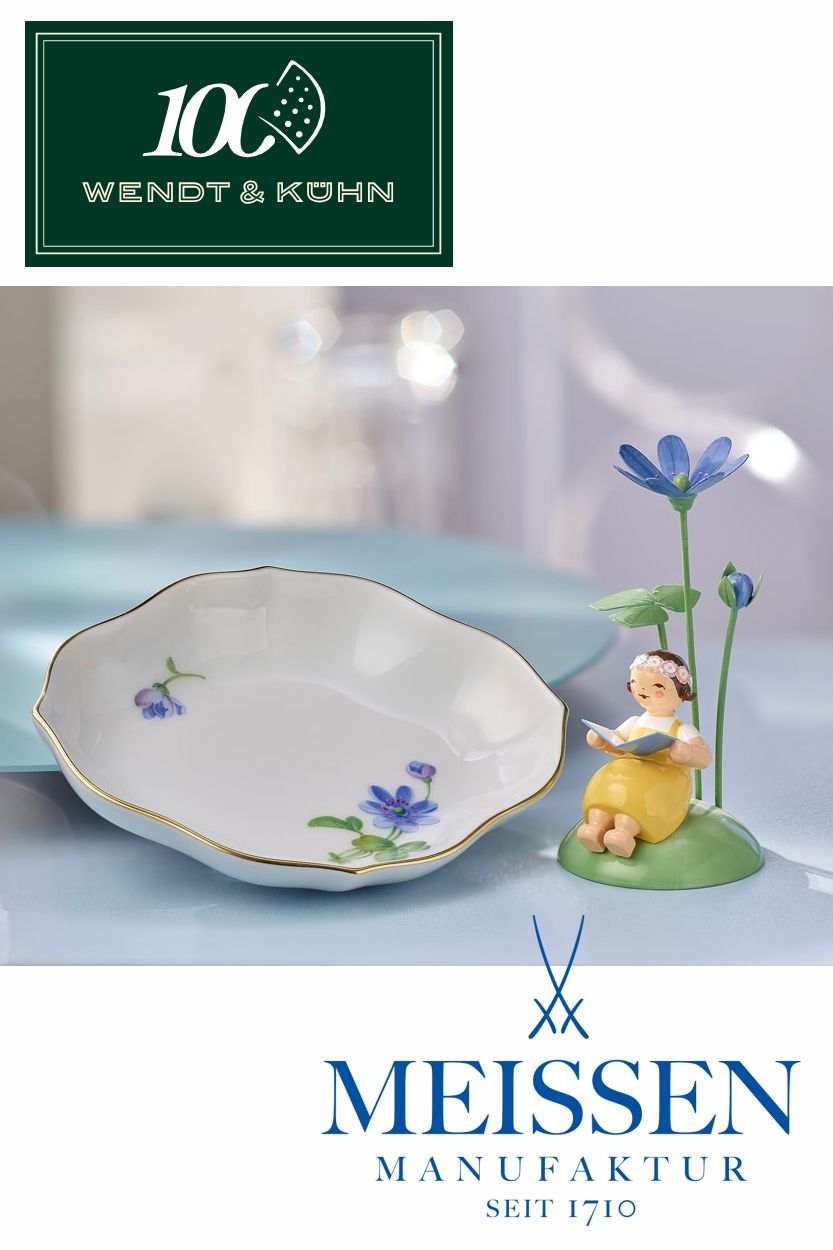 Wenn feinste Handwerkskunst von Wendt & Kühn auf die Raffinesse der Porzellan-Manufaktur Meissen trifft, entsteht etwas ganz Besonderes: ein Mädchen auf Hügel mit einer Blüte vom Leberblümchen, flankiert von einer edlen Porzellanschale mit selbigem Blumenmotiv. Die Exklusivität des Sets wird unterstrichen, indem auf der Unterseite der Porzellanschale die Jahreszahl 2023 aufgemalt wird - gleich unter dem weltberühmten gekreuzten blauen Schwertern.