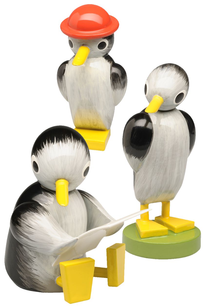 Fast zeitgleich mit dem internationalen Weltpinguintag am 25. April haben die Pinguine von Wendt & Kühn ihren großen Auftritt. Um sich an dem Trio zu erfreuen, müssen Liebhaber nicht extra in die Antarktis reisen, die Pinguine watscheln mit ihren großen gelben Brettchenfüßen direkt zu ihnen nach Hause. Ihr schwarz-graues Gefieder wirkt durch die lasierende Bemalung bauschig und weich. Das gestalterische i-Tüpfelchen ist wohl der drehbare Kopf des großen und mittleren Pinguins, der sie mal verstohlen zur einen, mal keck zur anderen Seite schauen lässt. Olly Sommer, später Wendt, gestaltete die Figurengruppe, neben vielen anderen Tierfiguren, bereits zwischen 1922 und 1925 und hinterließ einen fantasievollen Entwurf, der noch heute verzückt. Als Geschenk für kleine Entdecker, die es den Pinguinen gleichtun und mit großen Augen die Welt erkunden. Als Zeichen der Zuneigung für einen Menschen, mit dem man in treuer Pinguin-Manier für immer gemeinsam durchs Leben gehen will. Und natürlich für alle Fans der liebenswerten Frackträger.