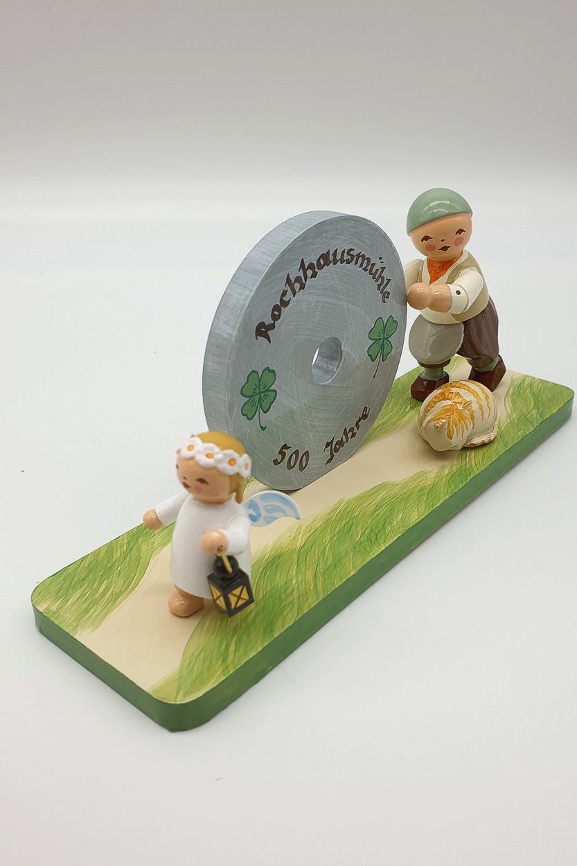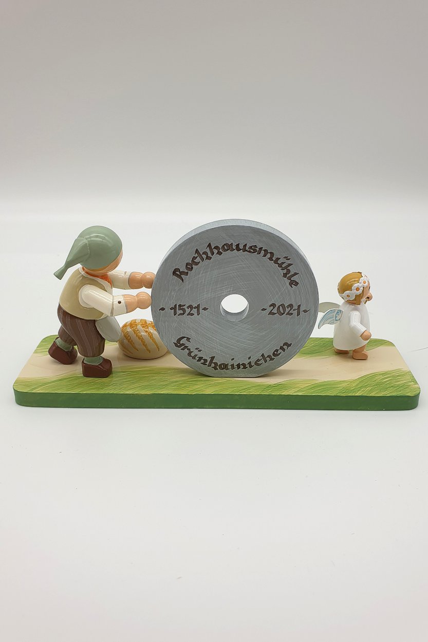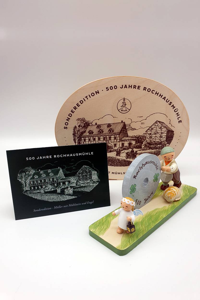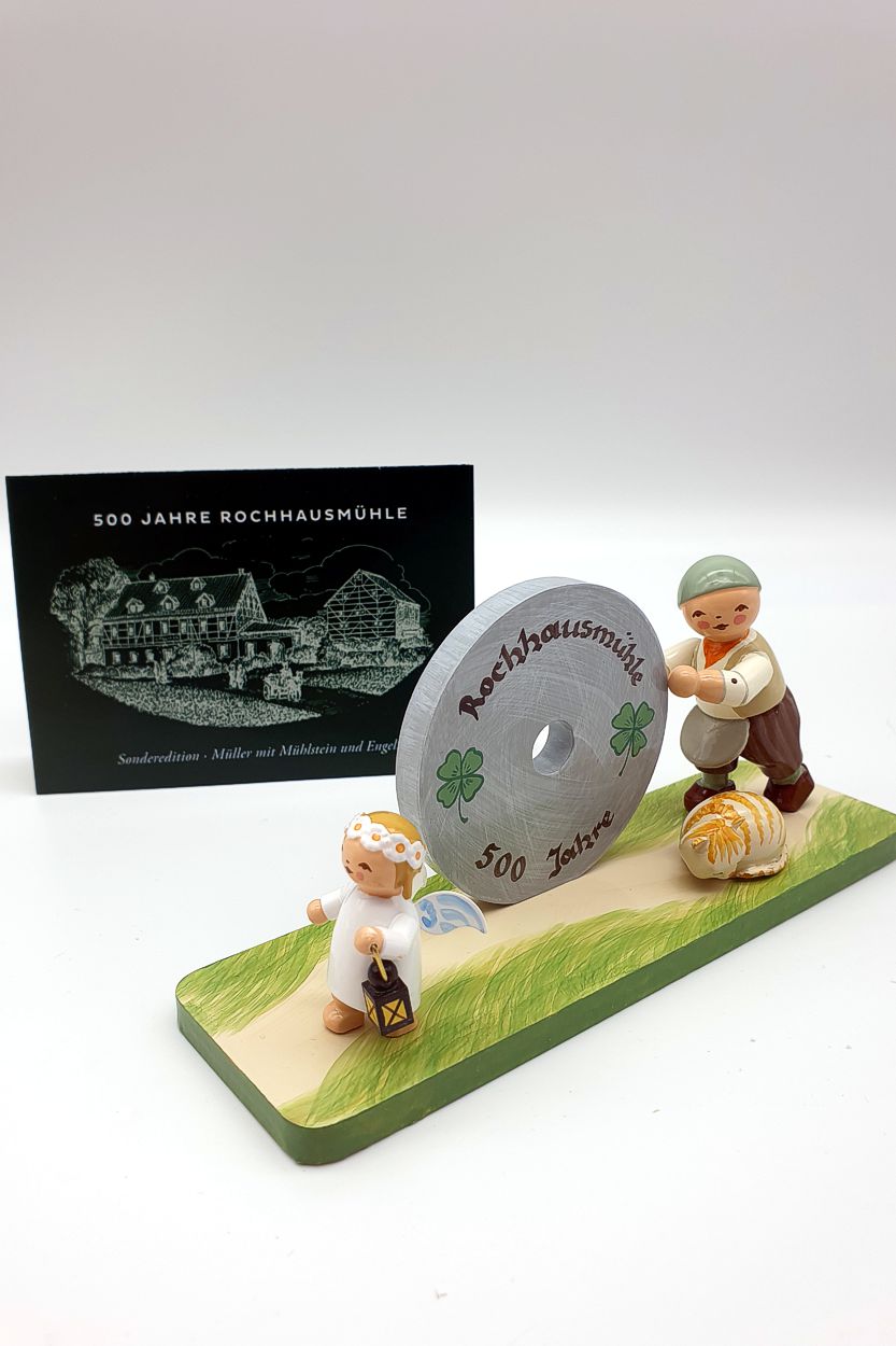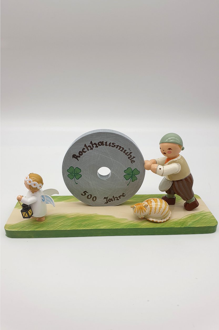Die Rochhausmühle Grünhainichen konnte 2021 auf eine 500jährige Geschichte zurückblicken. Das war Anlass eine Figurengruppe mit Müller, Mühlrad, Engel und Katze zu entwickeln. Wir sind froh darüber, Ihnen hier einige dieser eigentlich schon längst ausverkauften Figuren anbieten zu können. Diese Figur wird es so nie wieder geben.