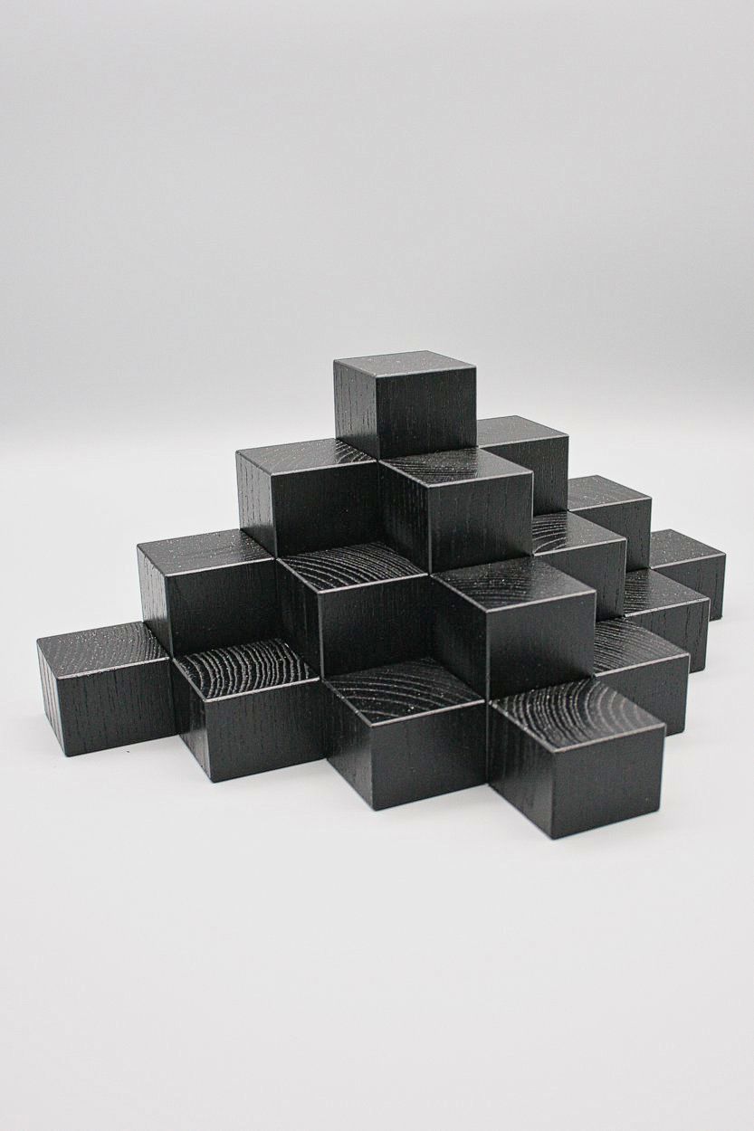 Die Holzquader mit einer Stellfläche von jeweils 4 x 4 cm sind fest zusammengeleimt und schwarz lasiert.