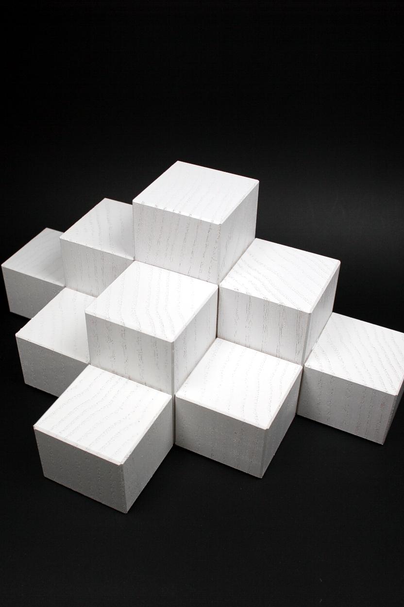 Die Holzquader mit einer Stellfläche von jeweils 4 x 4 cm sind fest zusammengeleimt und weiß lasiert.